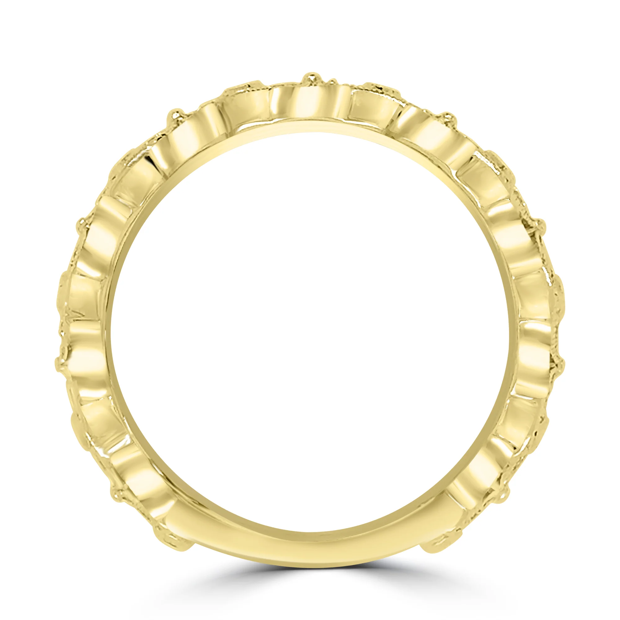 A timeless and classic fancy cut eternity band that will never loose its delicate graceful feel. Crafted with 18ct yellow gold, this band boasts a decorative and graceful vintage design marquise and round floral design that has been made up with natural brilliant round diamonds adding 0.55ct's, across 75% of the band. Presented on a hallmarked 750 yellow gold band.