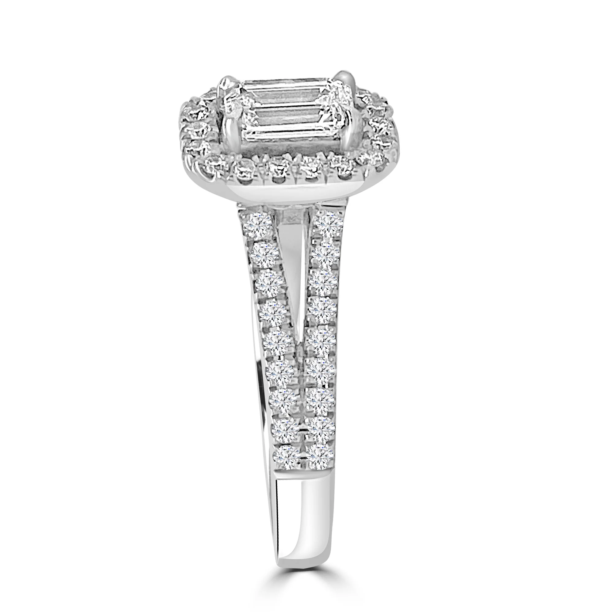 Platinum Emerald & Halo, Split Shoulder Set Diamonds, 0.64ct